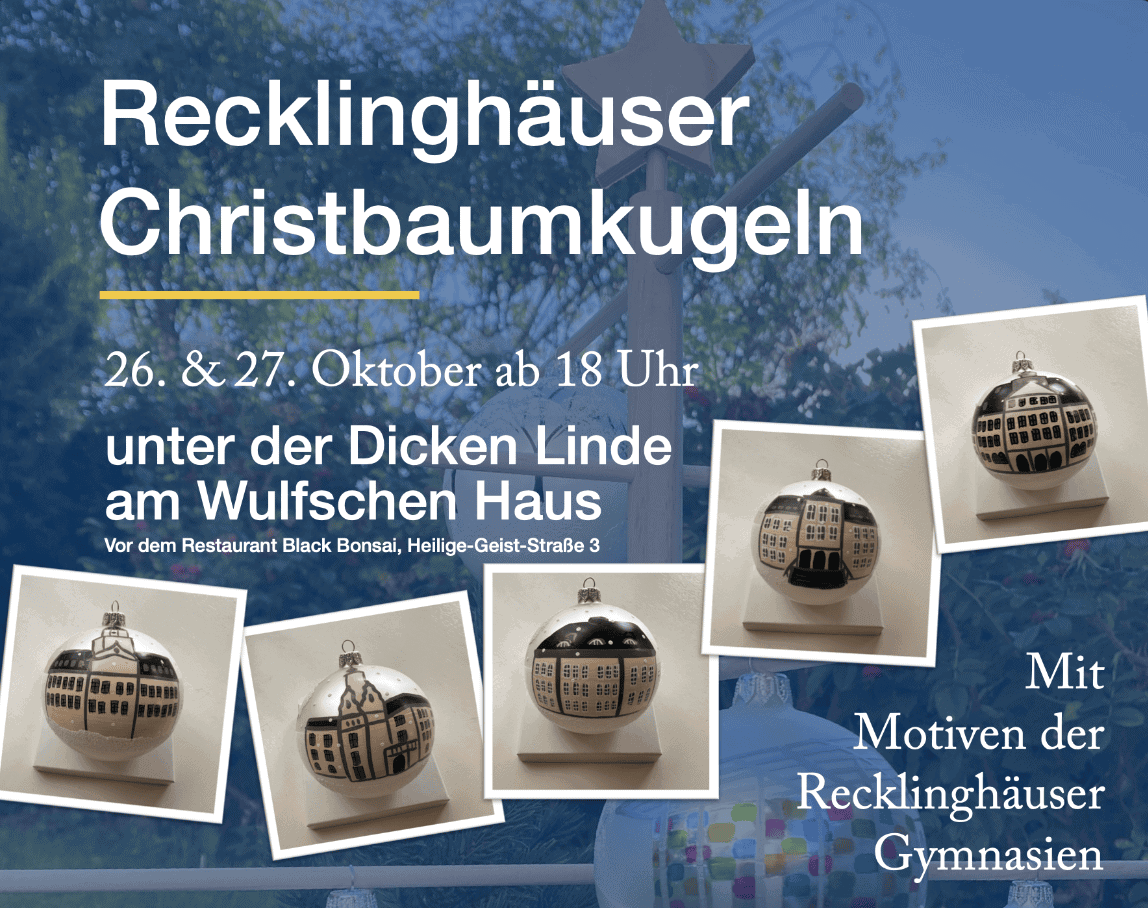 So bietet der Club seine Kugeln am ersten Samstag sowie Sonntag zu Recklinghausen Leuchtet bei geselligem Glühwein und Kaltgetränken zum Verkauf an. Unter der „Dicken Linde“ im Bürgermeisterviertel (neben Restaurant Black Bonsai) gibt es jeweils ab 18 Uhr ein neues Highlight in der Innenstadt. Die Verkaufserlöse gehen zu 100% an den guten Zweck und kommen RiVer zu Gute – ein Angebot für Kinder und Jugendliche mit psychisch belasteten und/oder suchtkranken Eltern.